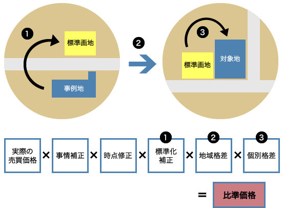 取引事例比較法は、まず多数の取引事例を収集して適切な事例の選択を行い、これらに係る取引価格に必要に応じて事情補正及び時点修正を行い、かつ、地域要因の比較及び個別的要因の比較を行って求められた価格を比較考量し、これによって対象不動産の試算価格を求める手法です。この手法による試算価格を比準価格といいます。