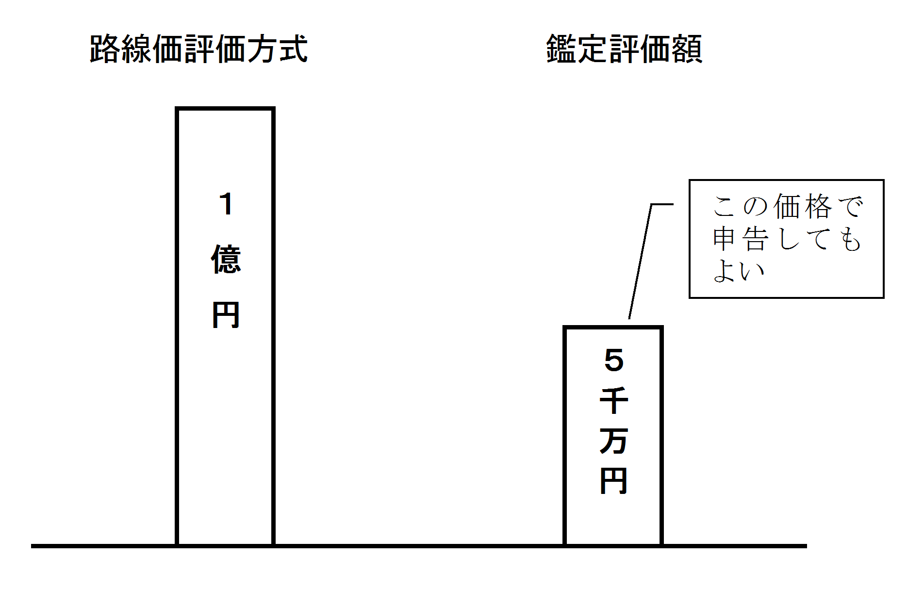もし、この土地を1億円で申告したら過大な納税をすることになります。そのときは適正な時価評価(鑑定評価)で申告することが妥当です。