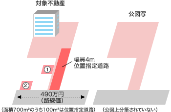 - 公図上では宅地部分と道路部分(位置指定道路)が分筆されていませんが、道路部分は宅地部分と違い、建築に際して建ぺい率、容積率の算定面積に算入されませんので別々に評価するのが妥当です。