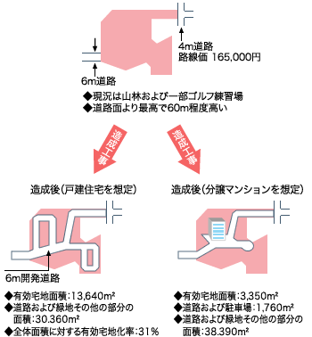 この場合、土地有効使用の観点から考察し、現況の山林および一部ゴルフ練習場としての利用ではなく、造成等による戸建住宅の敷地と判定しました。しかし実際に想定してみると、有効宅地化率が31%とかなり低位に求められたため、一方で、立体で利用する方法として分譲マンションも想定し、これら2つの方法を使い、それぞれの販売価格より造成費等の必要諸経費を控除し、現況の価格を算定することが妥当と考えます。