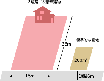 この地域の標準的画地の面積は、概ね200m²です。それに対し対象不動産は有効部分で530m²あります。間口が15m、奥行35メートルですから半分に分割することもできません。面積が大きすぎると、単価が相対的に逓減します。鑑定評価ではこれを『面大減価』と表現します。