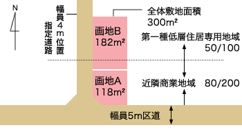 | 用途地域 | 近隣商業地域(建ぺい率:80% 容積率:200%) ※幅員5m区道から15m以内 第一種低層住居専用地域(建ぺい率:50% 容積率:100%) ※幅員5m区道から15m超 |