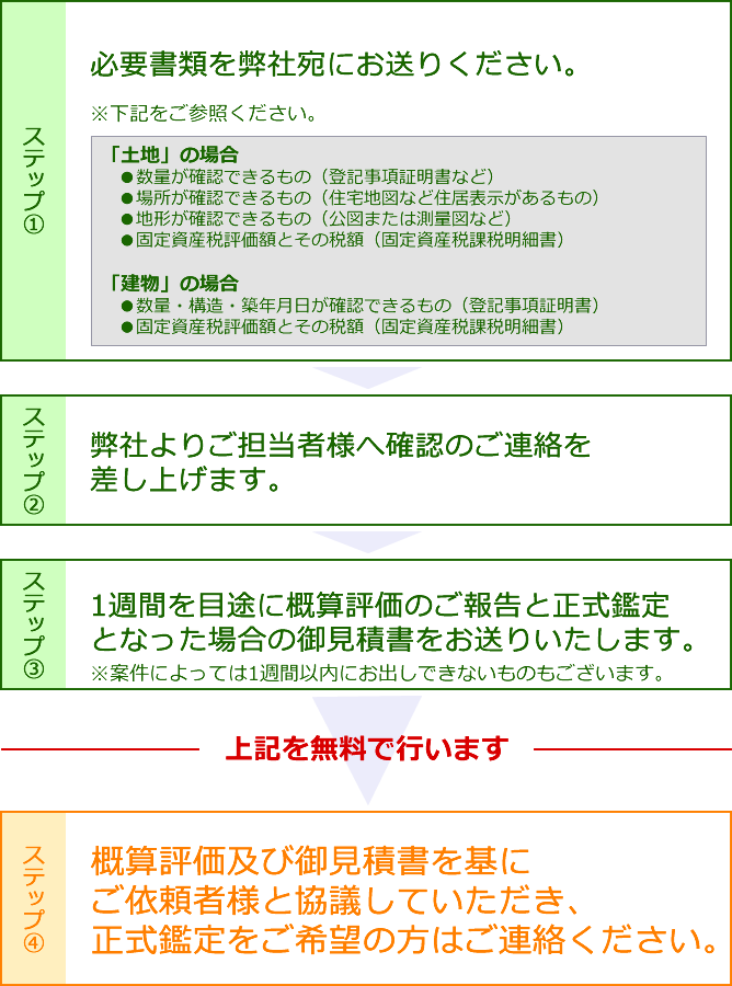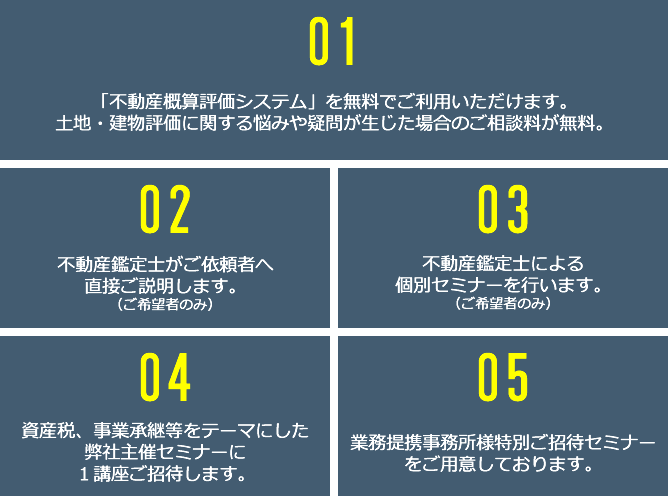 「不動産概算評価システム」は、顧問先・クライアントの所有する不動産について、土地評価・建物評価・路線価評価などの評価に関する問題点、あるいは、収益不動産の賃料査定、同族間売買・生前贈与などについて、弊社の不動産鑑定士が「ご相談」や「机上概算評価」を行います。「不動産概算評価システム」は、弊社と「〈無料〉業務提携」を交わしていただくことで、無料でご利用いただけます。